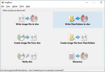 The program can burn most types of CD/DVD images. ImgBurn has a number of options, where you can set associations with the supported image file extensions (BIN, GCM, LST, UDI, CDI, FI, MDS, CDR, IMG, NRG, DVD, ISO, PDI) and select the burning interface (ASPI, ASAPI, SPTI).