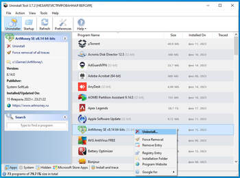 - Forced Uninstall - allows you to uninstall programs with damaged uninstaller