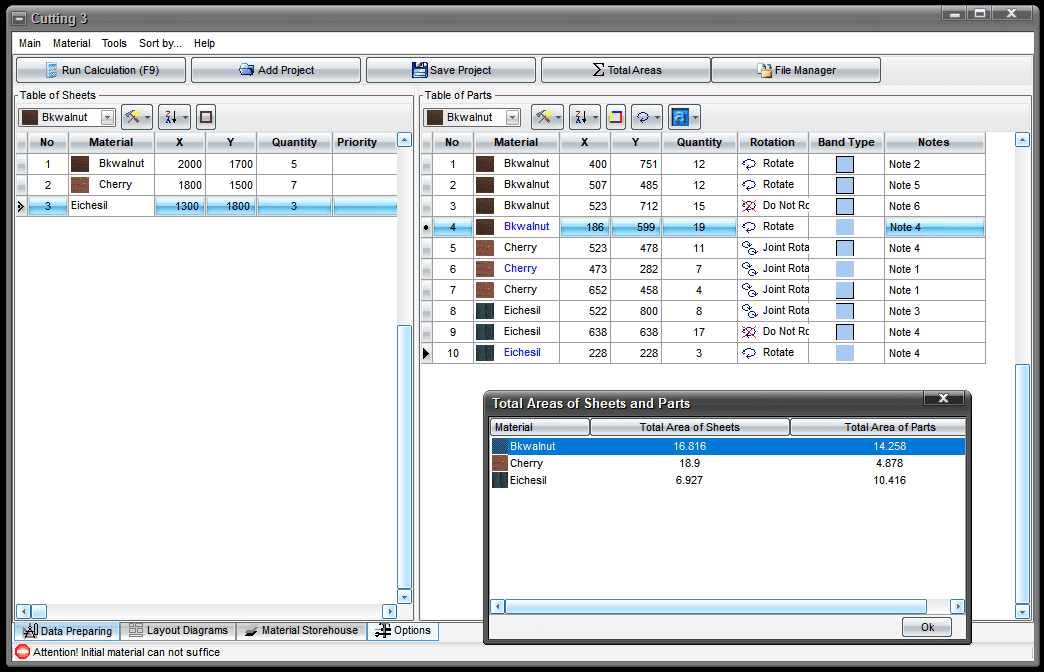 | Limitations: | 30 runs, no more than 3 rows in the sheet table, no more than 0 sheets in the parts table, print no more than 3 sheets |