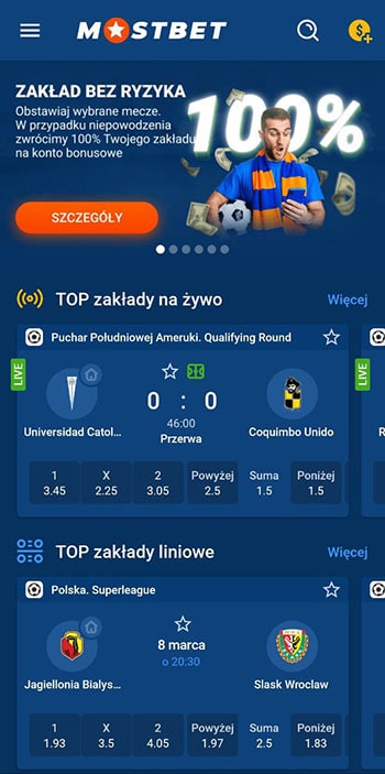 Dla wygody zalecamy pobranie oficjalnej aplikacji Mostbet na Androida. Aplikacja ma taką samą funkcjonalność jak główna wersja strony internetowej bukmachera MostBet. Tutaj będziesz mógł obstawiać zakłady sportowe, oglądać transmisje na żywo, grać na automatach, a także aktywować dostępne bonusy.