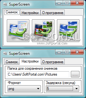 SuperScreen - программа предназначена для снятия скриншотов с экрана монитора. Позволяет делать скриншоты: всего экрана, активного окна или выделенной области экрана и сохранять их в формате PNG, JPG, или GIF. Присутствует функция задержки, а также возможность снять скриншот с видео.
