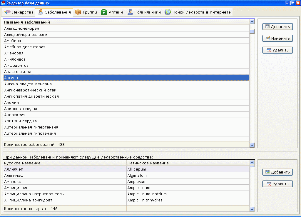 Справочник лекарственных средств - cправочник содержит информацию по 14 тысячам лекарственных средств включая синонимы названий. С помощью этой программы Вы без труда сможете найти лекарства необходимые для лечения указанного Вами заболевания. В базе данных справочника содержится информация по 430 заболеваниям.