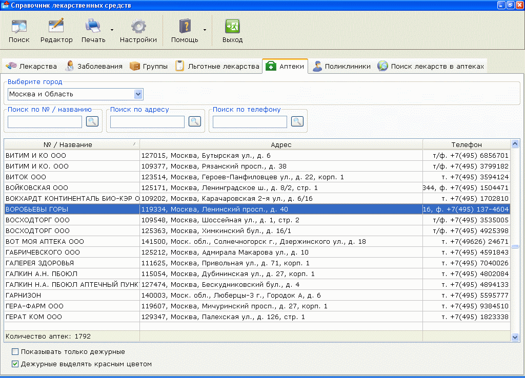 В базе данных справочника содержится информация по аптекам и поликлиникам Москвы, Московской области и Санкт-Петербурга. Кроме этого, присутствует система по поиску лекарств в аптеках через Интернет.