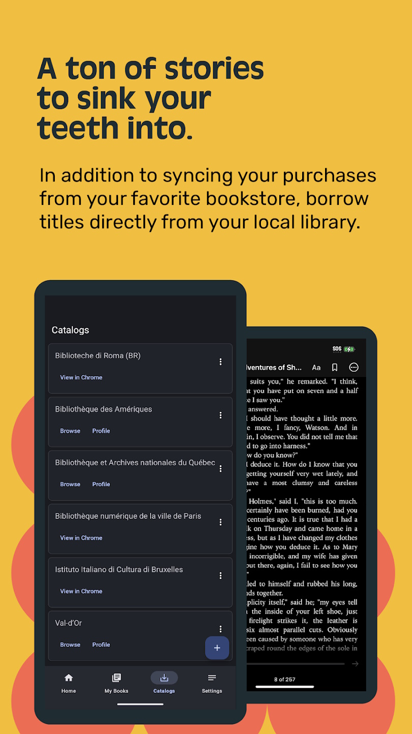 Aldiko Book Reader — удобная и красивая программа, с помощью которой можно читать книги на Android-устройстве. Книги можно искать в различных онлайн-каталогах и загружать на смартфон/планшет. Вы сможете собрать на коммуникаторе целую библиотеку, которая будет всегда под рукой. Во время чтения можно быстро переходить между главами, делать закладки, гибко настраивать интерфейс приложения.