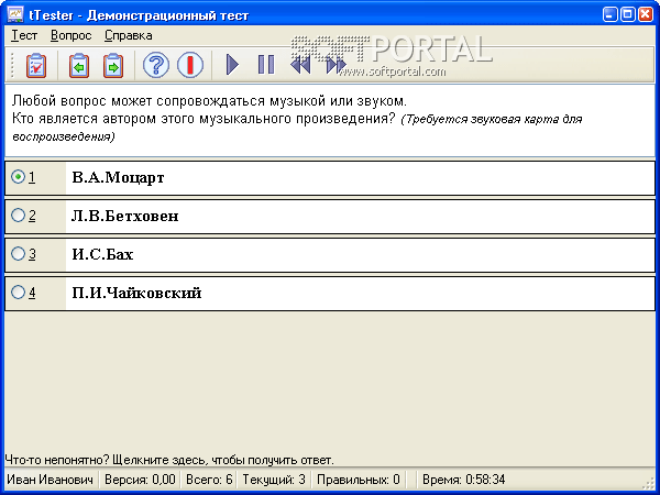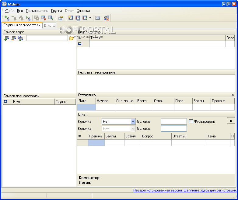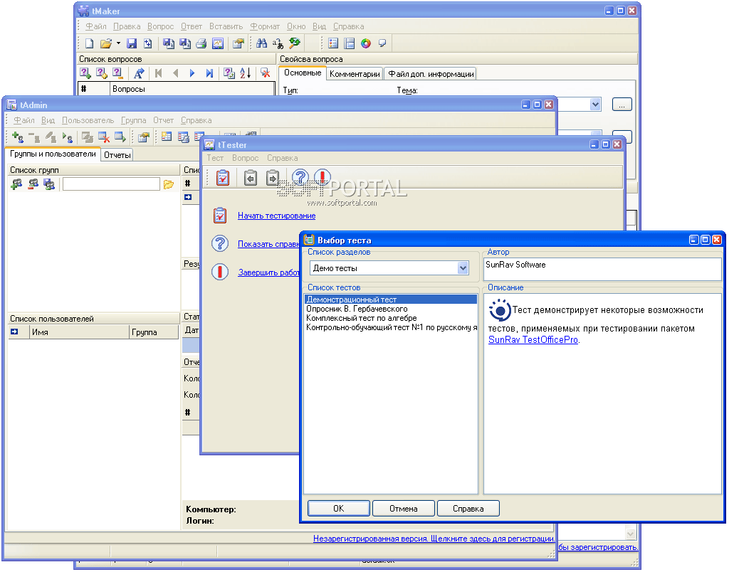 SunRav TestOfficePro - программа включает в себя tMaker - программу для создания тестов; tTester - программу для проведения тестирования; SunRav TestOfficePro - пакет программ для создания, проведения различных тестов и обработки результатов тестирования. По сути, это уже готовое комплексное решение для проведения тестирования в рамках образовательных и других учреждениях (вузы, колледжи, школы, отделы кадров предприятий и т.п.). tAdmin - программу для удаленного администрирования пользователей и обработки результатов тестирования.
