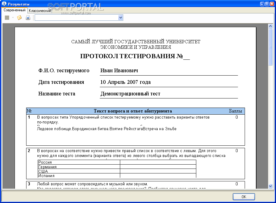 С помощью этого пакета можно легко создавать тесты по любым предметам школьной программы, по любым ВУЗовским дисциплинам, любые тесты для узкопрофессионального тестирования, различные психологические тесты и т.д. В своих теста вы можете использовать различные шрифты, формулы, схемы, таблицы, аудио- и видео- файлы, HTML документы и любые OLE документы. Любой вопрос и ответ можно полноценно форматировать - различные шрифты, выравнивание, абзацы, списки, верхние и нижние индексы и т.д. При этом вся информация шифруется методами стойкой криптографии. С помощью этого пакета можно организовать тестирование посредством сети Интернет/Интранет как с использованием базы данных MySQL, так и без нее.