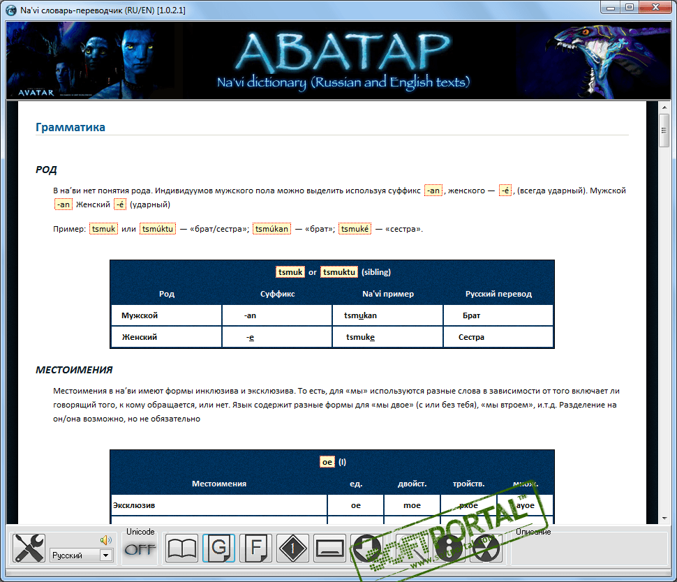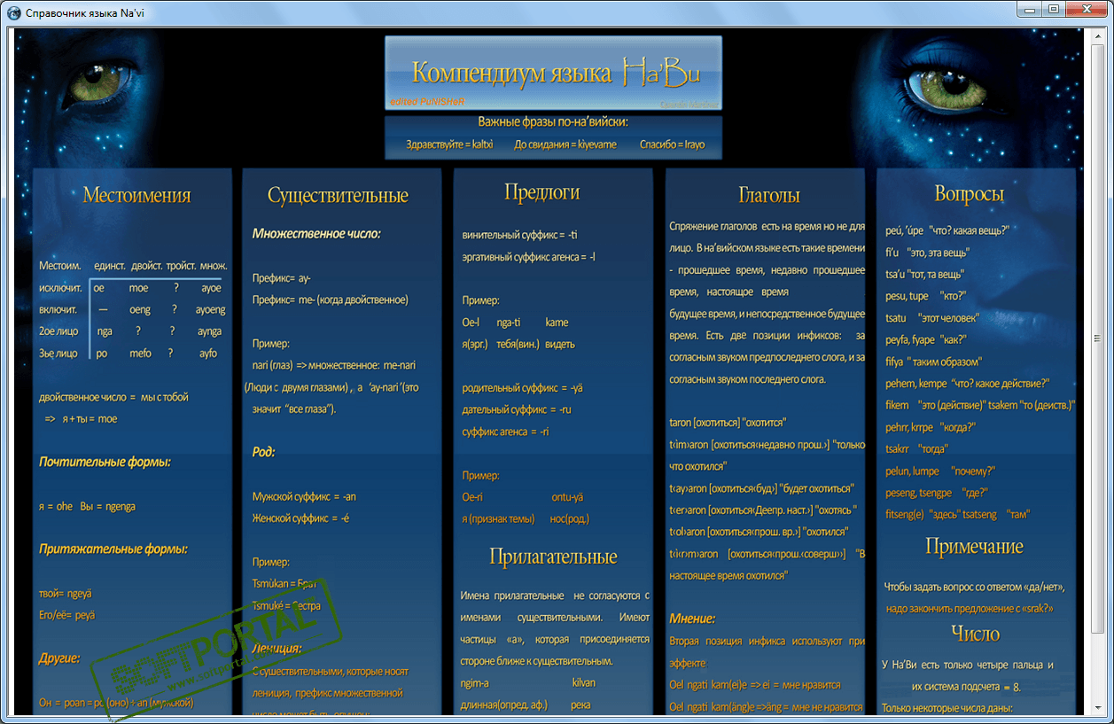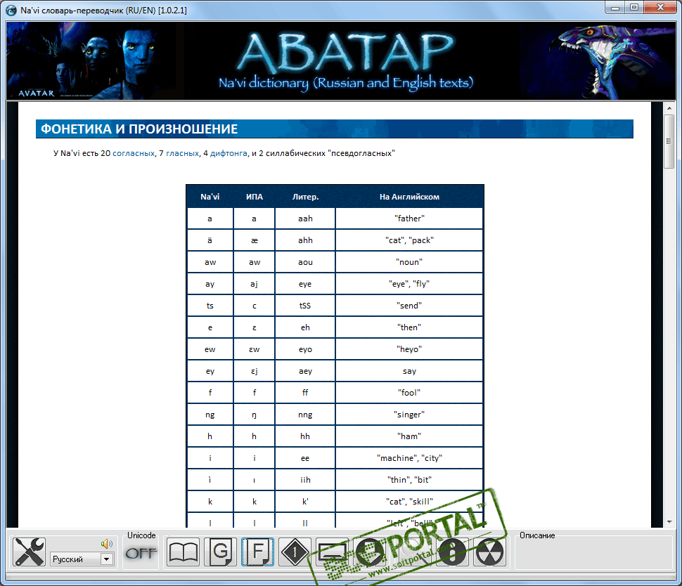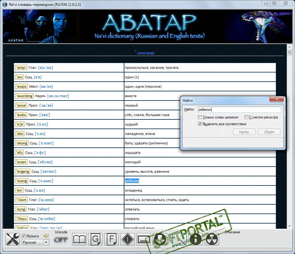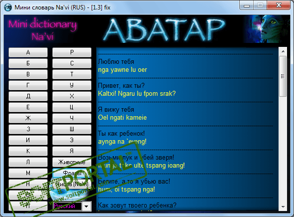 Navi словарь-переводчик - это огромная, переведенная на Русский язык база слов аборигенов Na'vi из фильма АВАТАР (Джеймса Кэмерона). В словаре насчитывается около тысячи слов, к каждому из которых написана транскрипция на Русском и Английском языках.