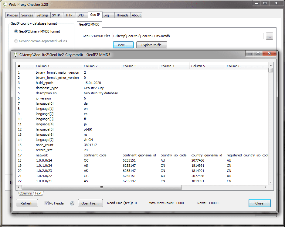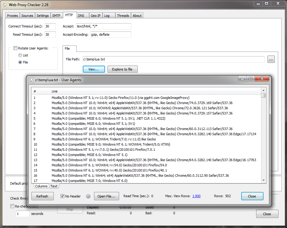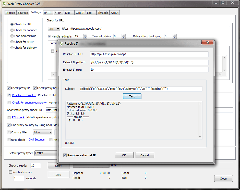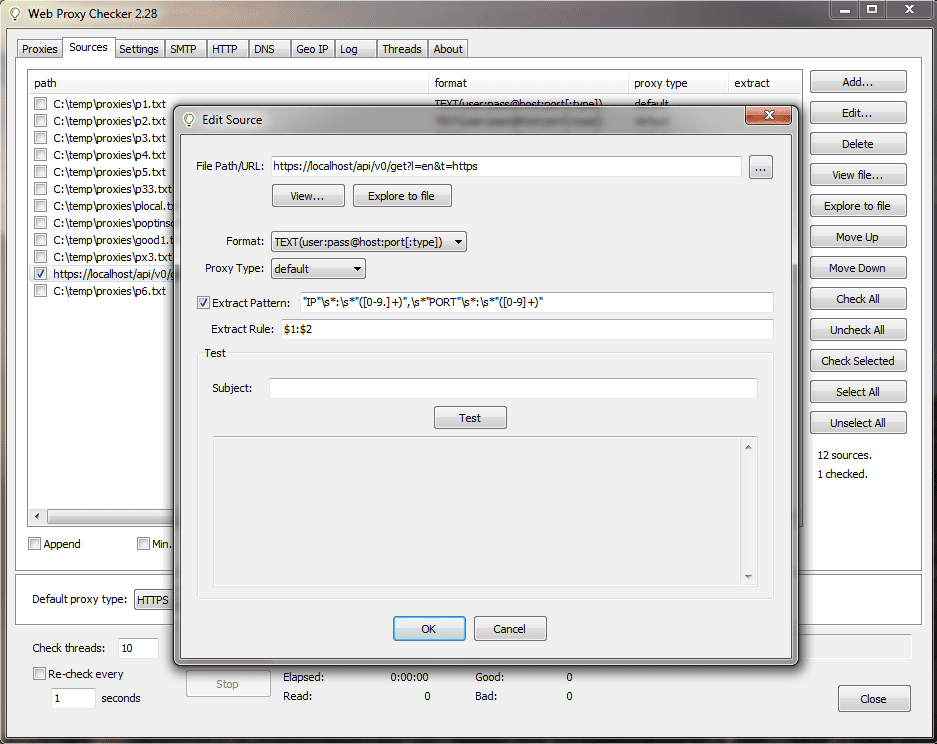 Web Proxy Checker - программа для проверки SOCKS4/SOCKS5/HTTP/HTTPS прокси-серверов с аутентификацией и без нее. Имеет многопоточную архитектуру и позволяет проверять прокси в двух режимах: проверка доступности прокси сервера (check for connect) и проверка возможности загрузки URL через прокси (check for URL). Также присутствует возможность загрузки прокси-листа с указанного URL, имеется встроенный сервер раздачи прокси, обработка редиректов и многое другое.