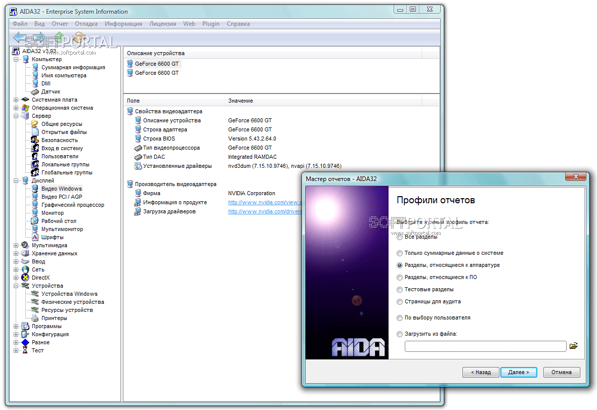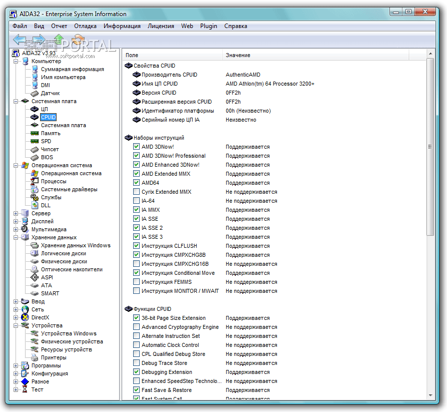 AIDA32 - профессиональный инструмент для диагностики оборудования и анализа системной конфигурации. Анализирует компьютер и выдает подробную информацию как об его аппаратной части (процессор, материнская плата, монитор и видеоподсистема целиком, диски и т.д.), так и о программной начинке - операционная система, драйверы, все установленные и отдельно автозагружаемые программы, запущенные процессы, лицензии, хотфиксы и т.д.
