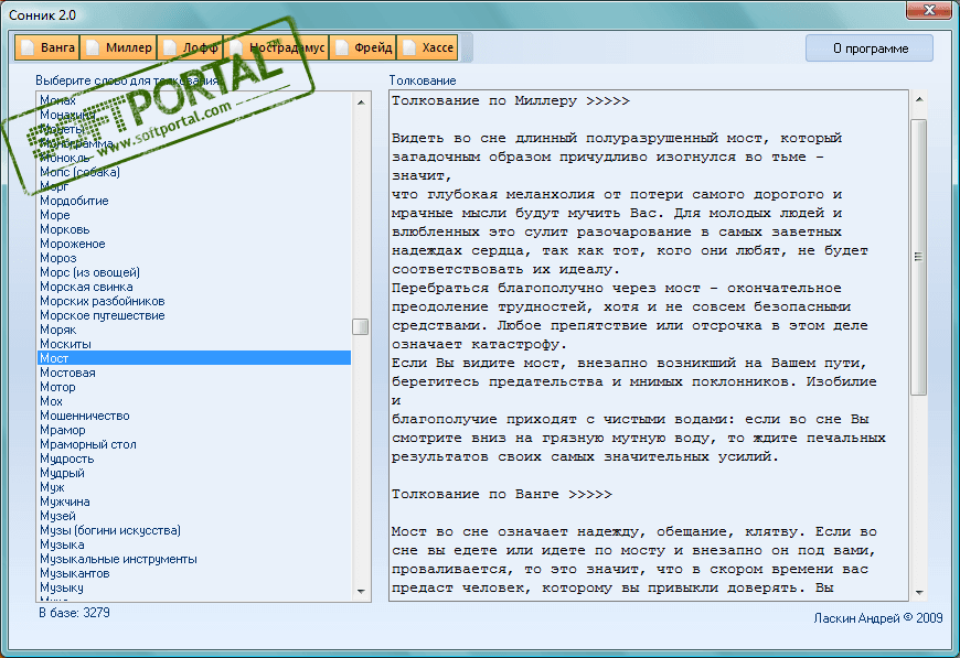 Сонник - программа призвана помочь разгадать тайны ваших снов. Использованы 6 разнообразных сонников от: Ванги, Лоффа, Хассе, Нострадамуса, Миллера, Фрейда...