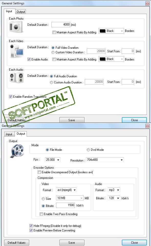 Foto2Avi - бесплатная программа для конвертирования графических файлов (JPG/PNG/BMP) в видео формат (AVI/MPEG/FLV). При конвертировании можно настраивать длительность показа каждой картинки с точностью до миллисекунд, устанавливать один из более, чем 30 эффектов переходов между изображениями от простой регулировки яркости до сложного эффекта искажения и добавления анимации, подключать звуковое оформление в аудио формате (MP3/OGG/WAV), и в результате получить красивейшее видео слайд-шоу.