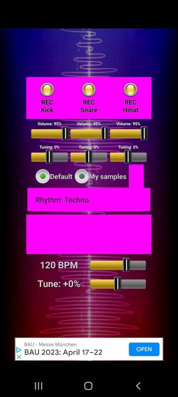 В приложение интегрирован 16-полосный секвенсор. Позволяет воспроизводить ритмы с переменной скоростью. Можно записать свой голос, выбрав функцию «My samples», и затем выбрать любой ритм, например, «Rhythm: Techno» и прослушать то, что получилось. Можно получить множество положительных эмоций. Особенно удачные образцы можно сохранить.