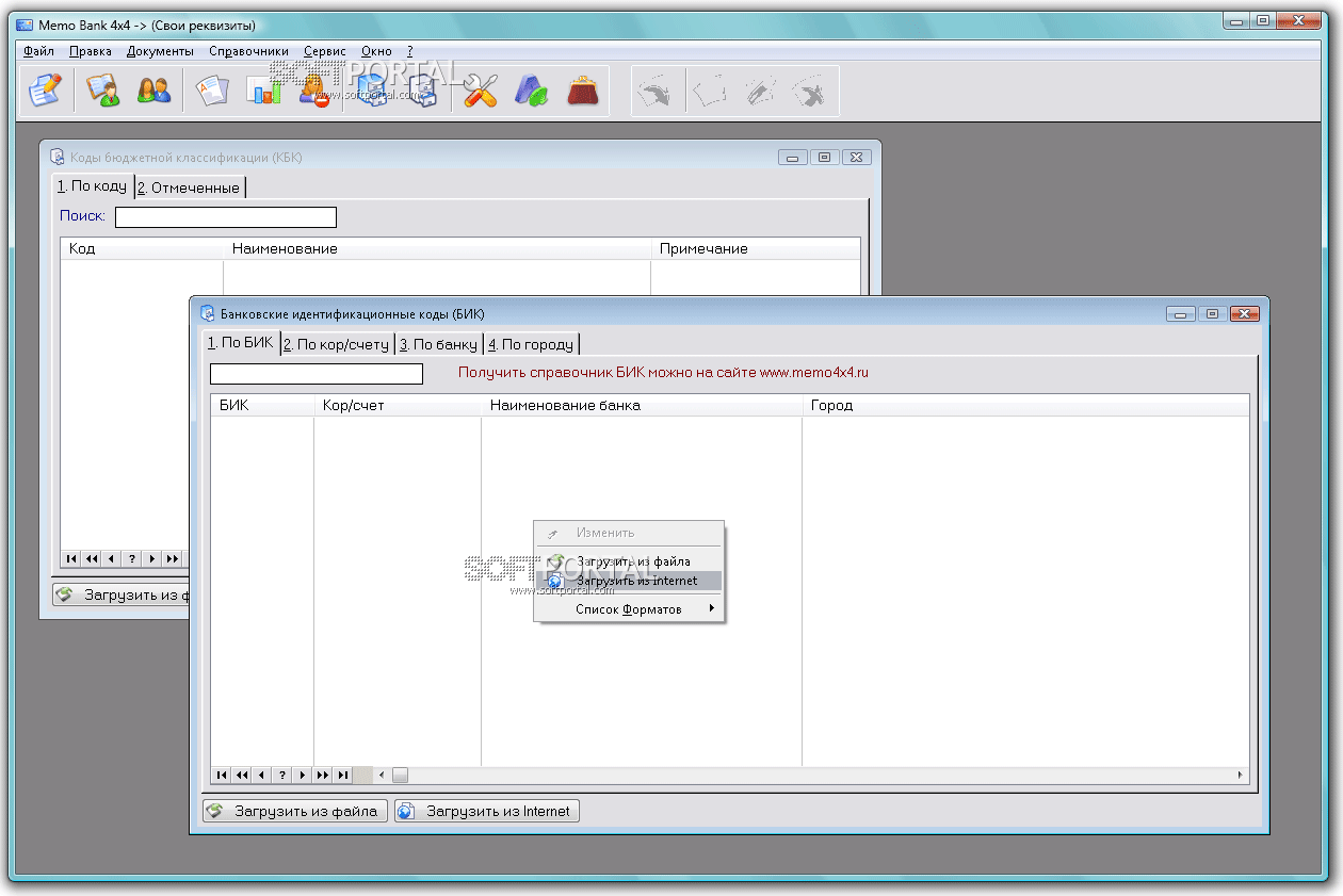 • Загрузка справочника кодов банков (БИК) и бюджетных кодов (КБК) из INTERNET;