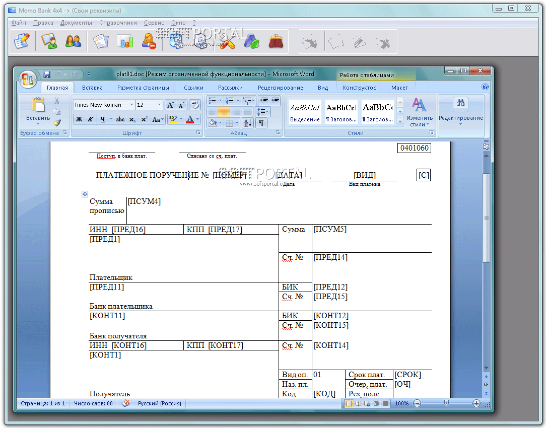 • Экспорт платежки в документ MS Word по шаблону;