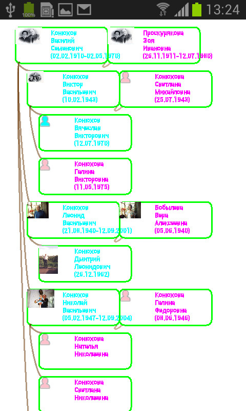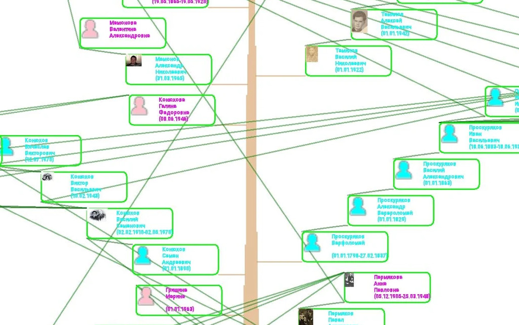 Несколько лет пользуюсь этой программой. Огромное спасибо Дмитрию. В древе уже 317 человек. Телефон всегда с собой, поэтому при встречах с родственниками всегда узнаёшь что-то новое и сразу вносишь в программу. Очень удобно.