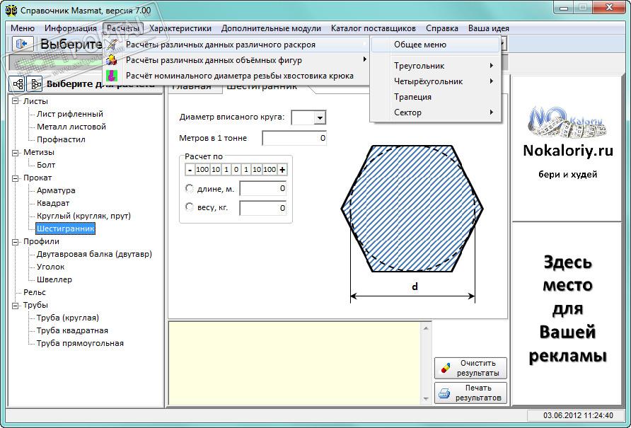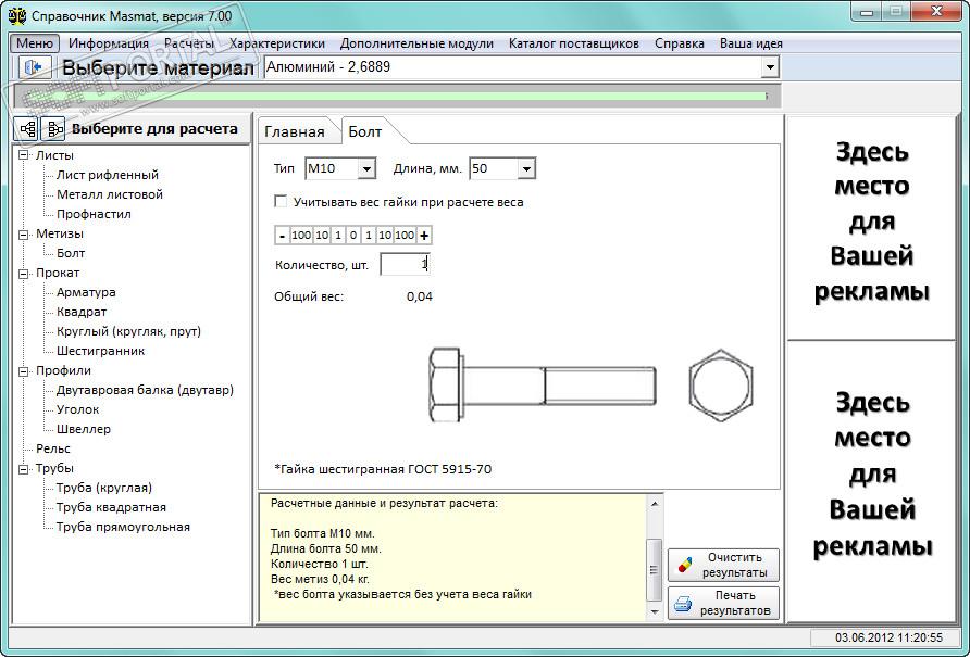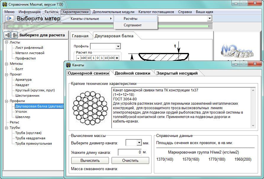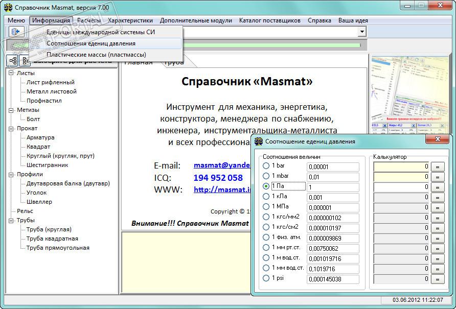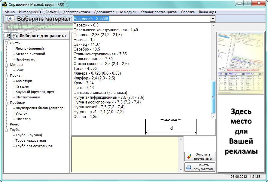 Справочник Masmat - программа для расчета массы стандартных материалов и профилей из различных металлов и количества материала по весу. Предназначена для механика, энергетика, конструктора, менеджера по снабжению, инженера, инструментальщика-металлиста и тех, кто работает с различными видами сортамента металлов (профили, листы, оборудование, трубы и т.д.).