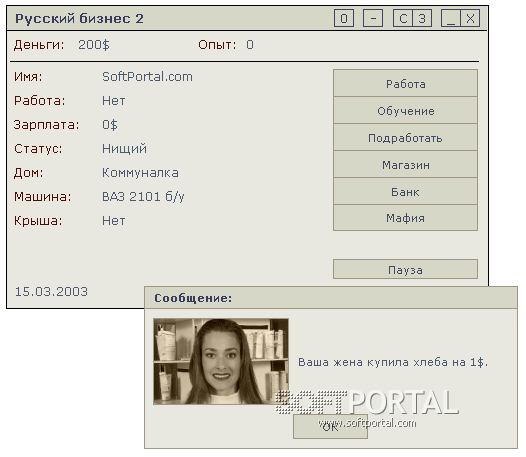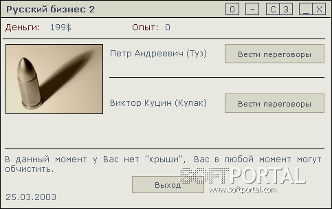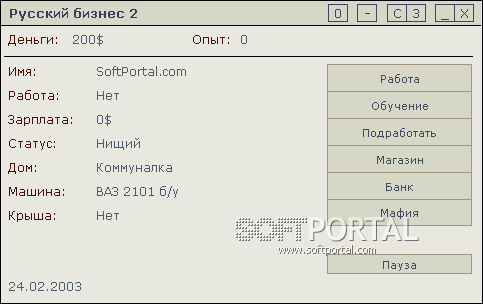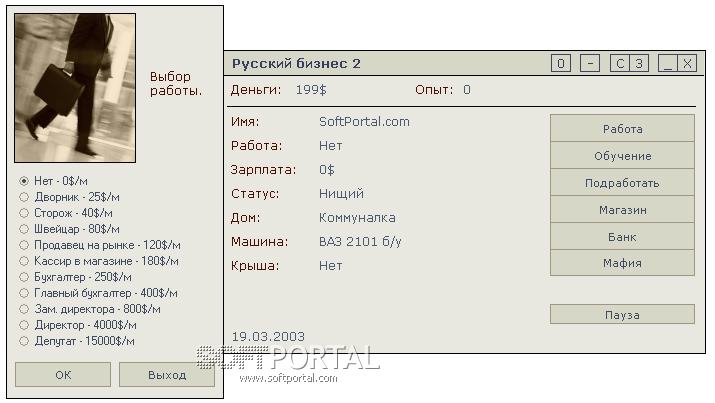 Русский бизнес - Игра - симулятор русского бизнесмена, в котором вам придется работать на бирже и искать работу, следить за своим имуществом, пользоваться услугами реалистичного банка, учиться, потому что определенные уровни требуют определенных навыков, быть готовым к неожиданым нападениям и ограблениям, диалогам с мафией, от которых будет зависить враг она Вам или друг, и конечно не забывать про свою жену, которая очень осведомлена по части траты ваших денег... Хорошая задумка, удачное воплощение плюс оригинальный интерфейс.