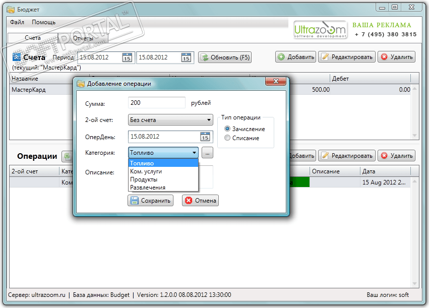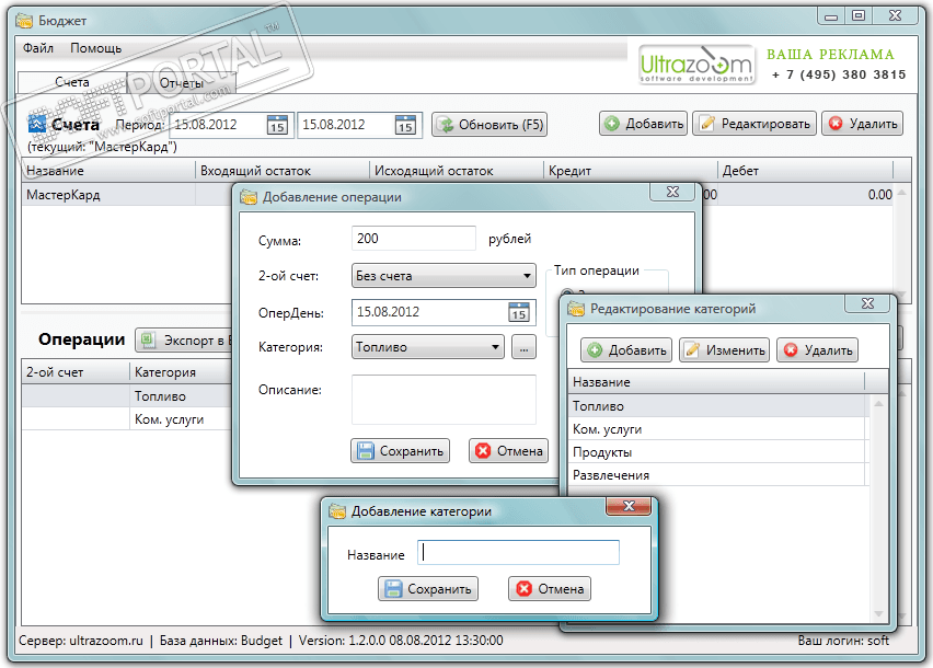 Бюджет - бесплатная и простая в использовании программа, которая предназначена для ведения учета в небольшой компании или домашней бухгалтерии. Присутствует возможность добавления и редактирования счетов, проведения по ним различных операций, осуществление перевода средств со счета на счет, получение статистики, экспорт в Excel и многое другое.