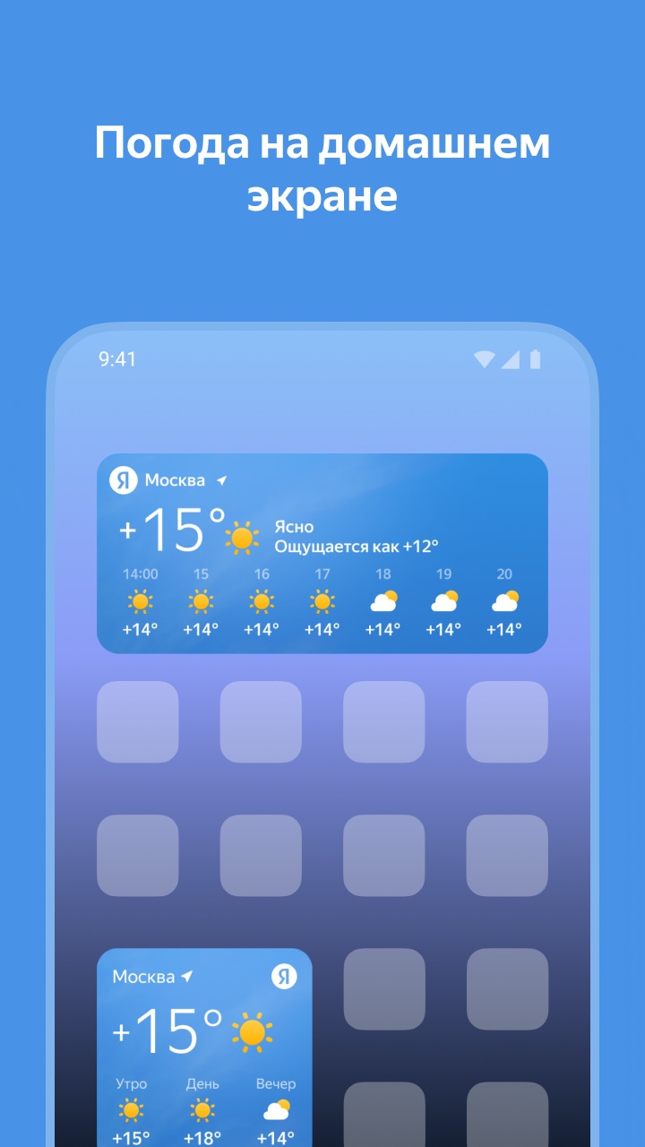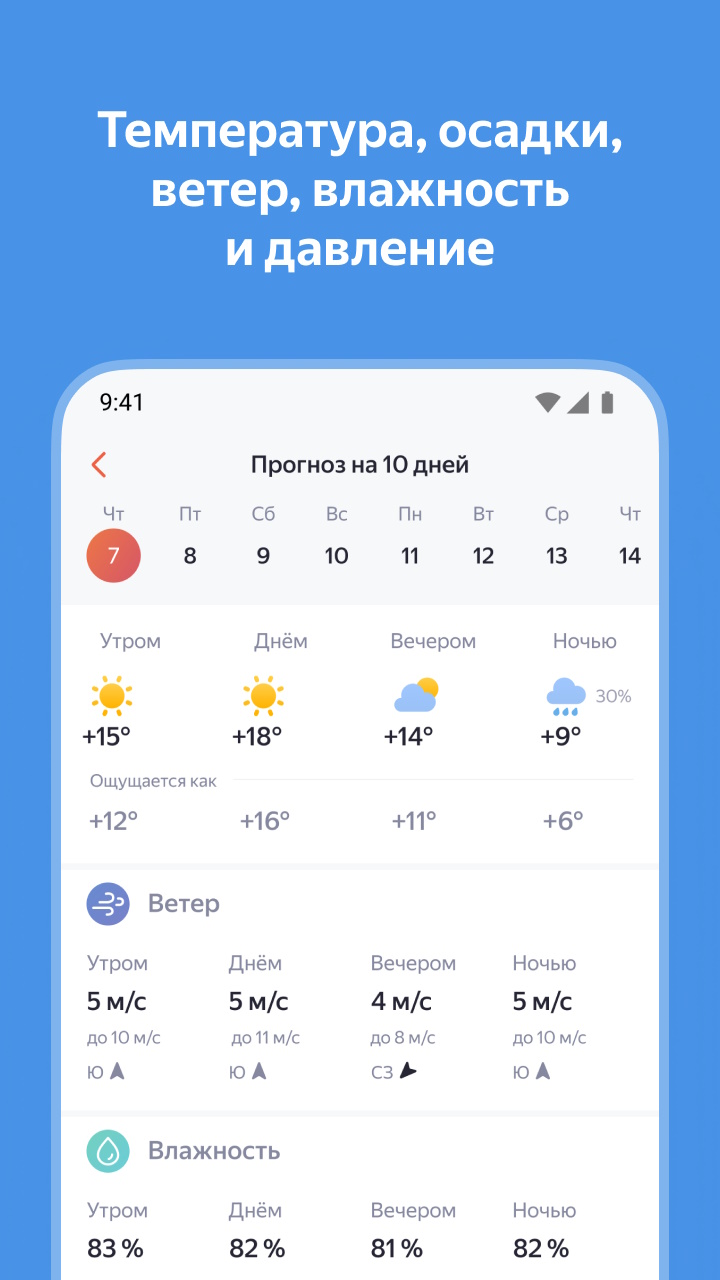 Яндекс.Погода - приложение для Android-смартфонов и планшетов, с помощью которого можно в любое время узнать подробный прогноз погоды (температуру воздуха, скорость ветра, давление и влажность) как на текущий момент, так и на следующие девять дней.