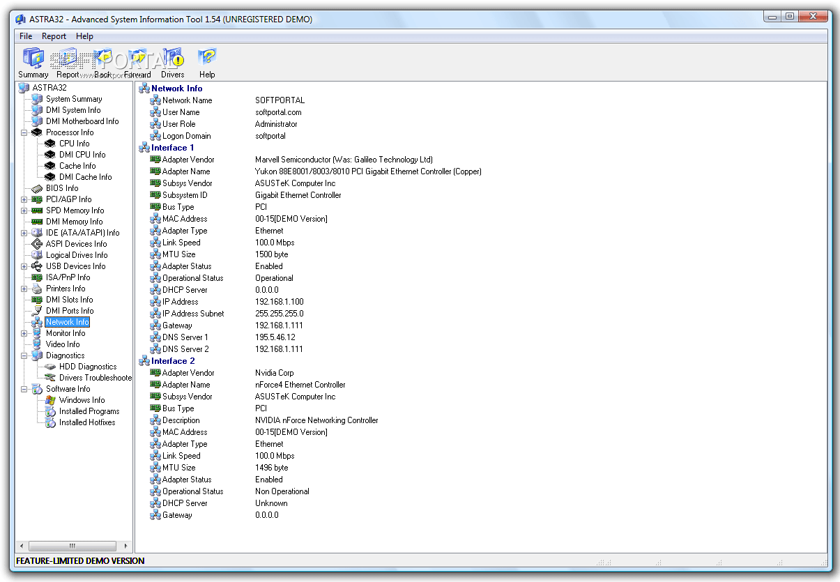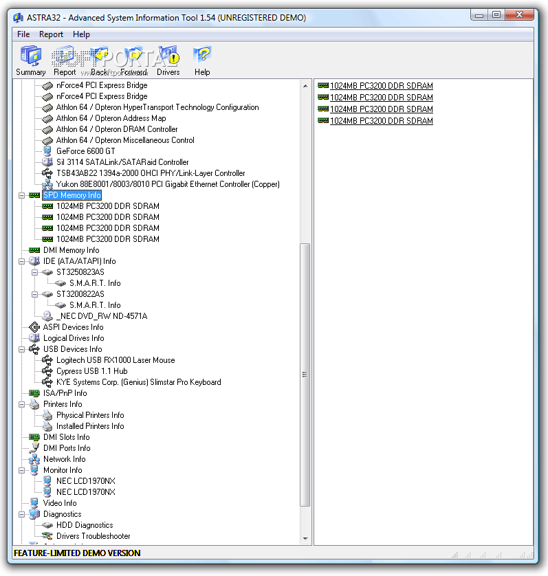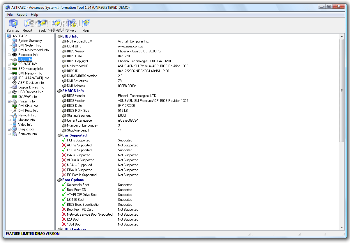 ASTRA32 (Advanced System Information Tool) - Программа определения конфигурации компьютера. Позволяет получить подробную информацию (в том числе недокументированную) о процессоре, кэше, материнской плате, жестких дисках, CD-ROM, модулях памяти, чипсете, BIOS, PCI/AGP и ISA/PnP устройствах, DMI/SMBIOS, видеокарте, звуковой и сетевой карте, принтере и многом другом. Создание файла-отчета, возможность экспорта данных в программы учета вычислительной техники. Возможность работы из командной строки.