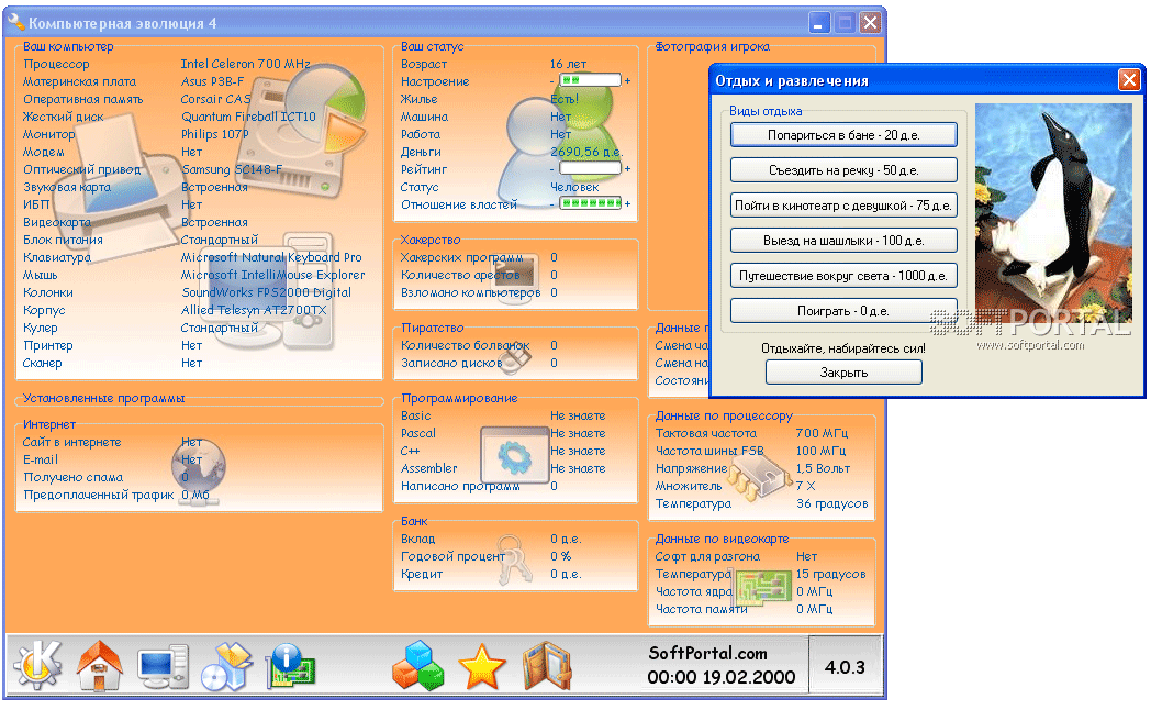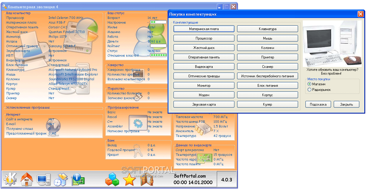 Компьютерная эволюция - эта игра представляет из себя шутливый симулятор жизни рядового компьютерщика с элементами экономики и юмора. Продолжение идеи Компьютерщика, только с элементами истории.