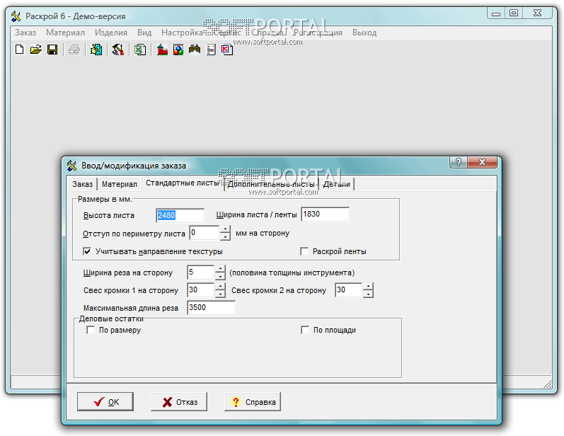 - При изготовлении деталей возможен некоторый технологический отход, связанный, например, расход материала на распил, отшлифовку края. Программа позволяет ввести и автоматически учитывать такой отход при расчете карты раскроя.