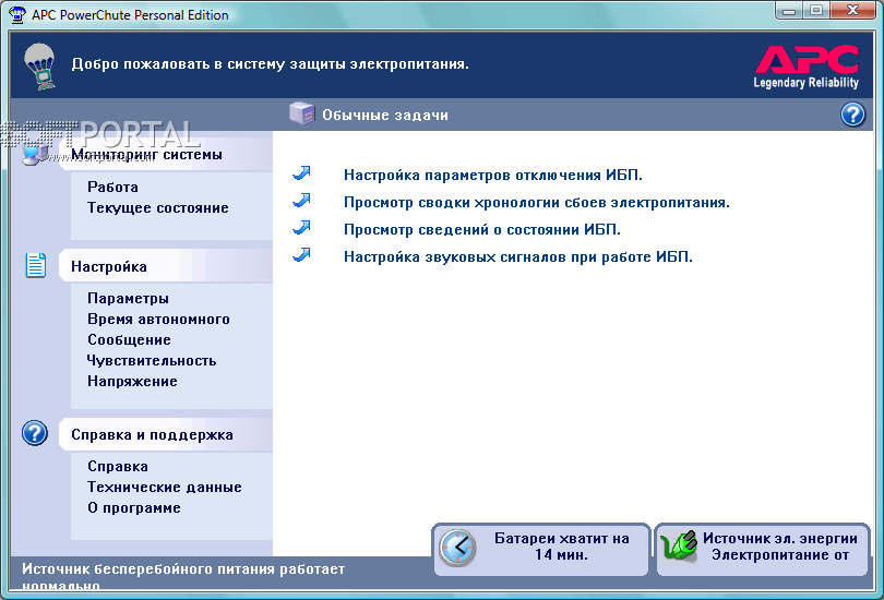 Основной функцией PowerChute Personal Edition является корректное завершение работы в случае продолжительного отключения электричества с гарантированной защитой от повреждения данных. Спроектированное в расчете на максимальное удобство в использовании и с опорой на опыт лучших в отрасли специалистов APC в области управления электропитанием это ПО позволяет построить оптимальную защиту даже не имеющим опыта пользователям; а квалифицированные специалисты оценят возможность настройки ПО в зависимости от тех или иных особых обстоятельств.