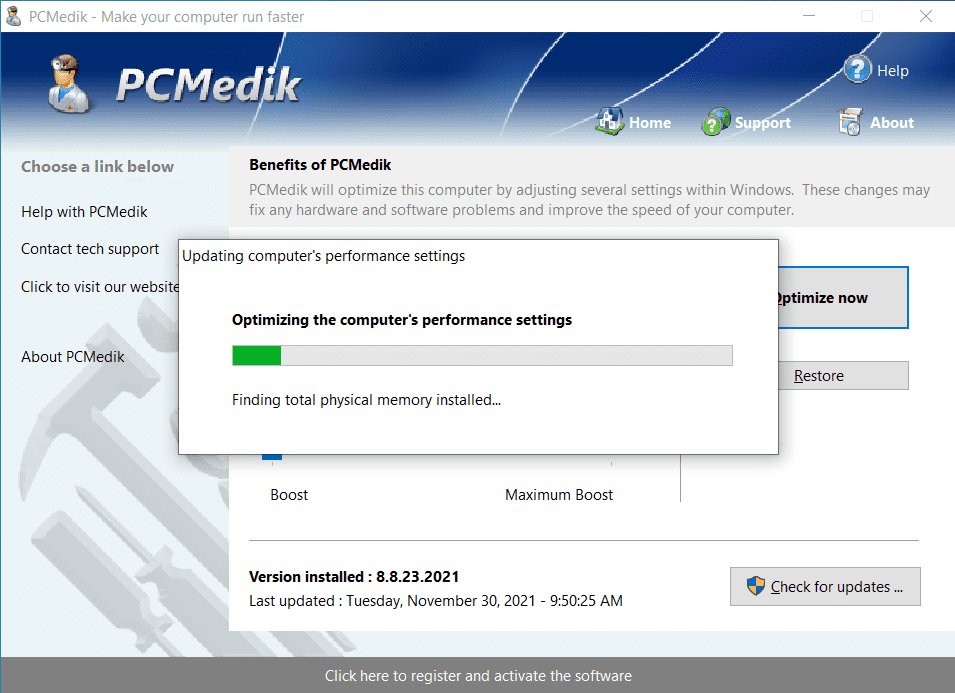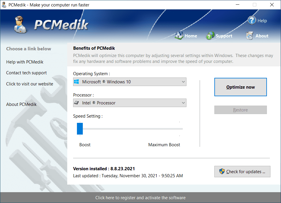 Требуется лишь указать операционную систему (Windows XP, например), производителя процессора (Intel, AMD, другой) и выбрать, что необходимо сделать: "вылечить" или "вылечить и оптимизировать". После применения PCMedik может заметно возрасти скорость работы приложений в среде Windows.