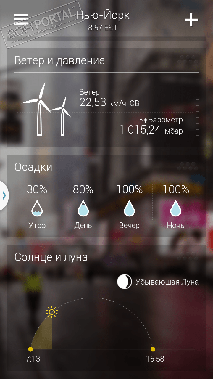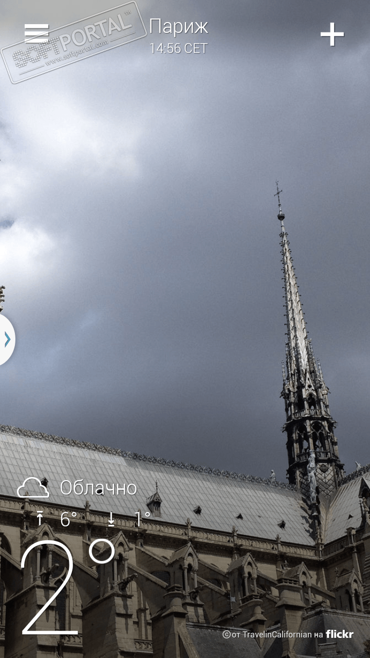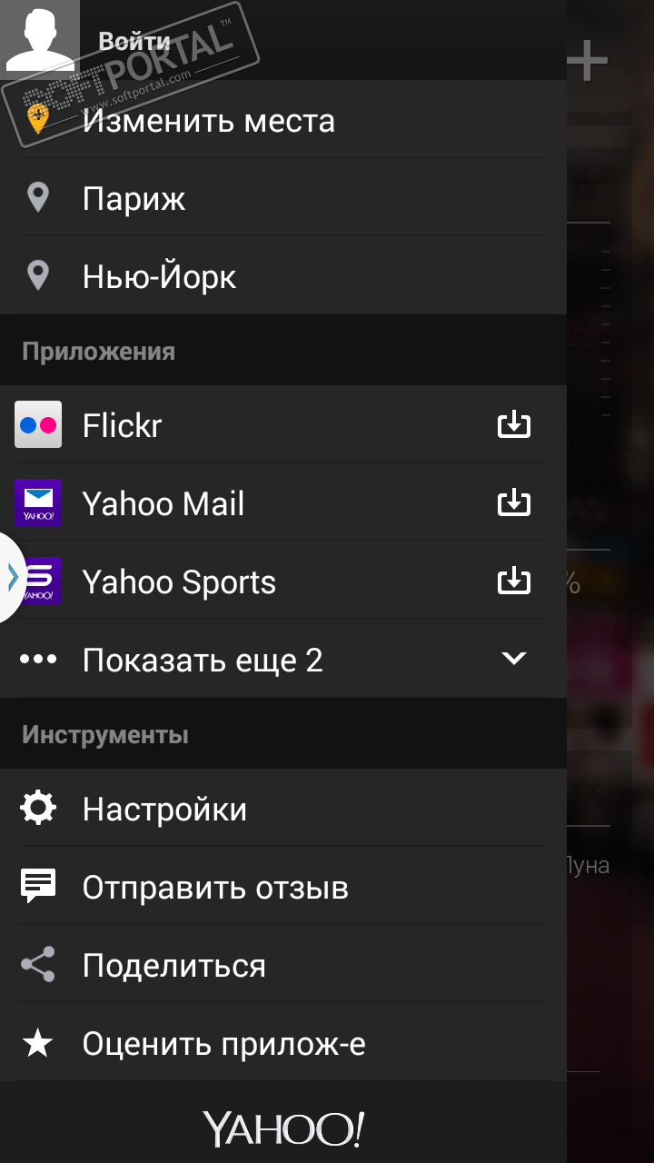 Yahoo Погода - стильное и красочное приложение для Android-устройств, которое предоставляет пользователю доступ к метеорологической информации для любого выбранного города, как например температура, влажность, давление, направление и скорость ветра, осадки, положении Луны и Солнца и др., причем все это сопровождается фотографиями достопримечательностей указанного населенного пункта (соответствующими времени суток и погодным условиям на данный момент) и радующими глаз эффектами.