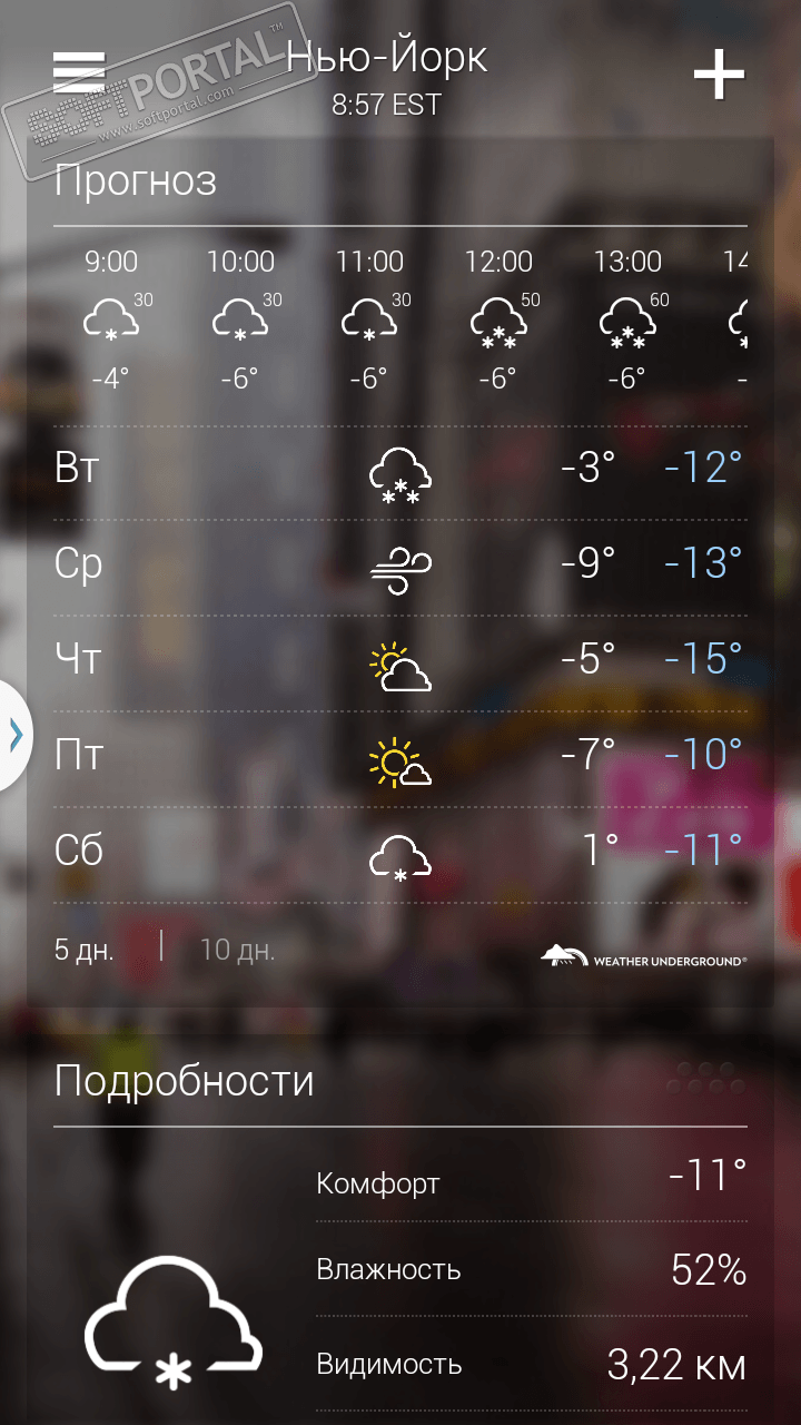 Присутствует возможность узнать как текущий прогноз погоды, так и на следующие десять дней, просматривать интерактивные погодные карты радаров, спутников, температуры и ветра. Имеется виджет для домашнего экрана.