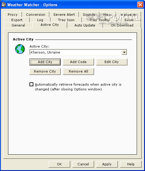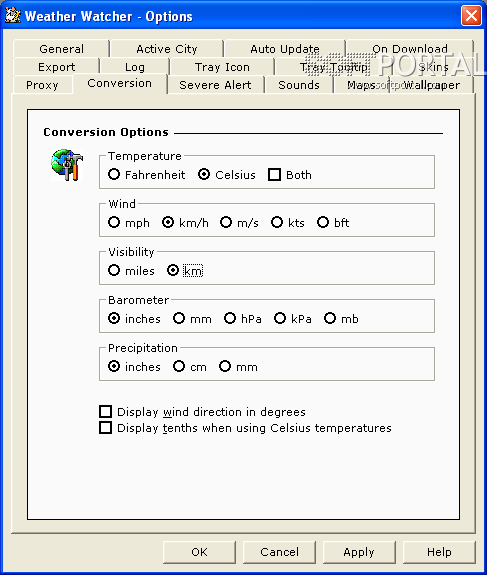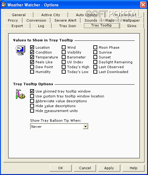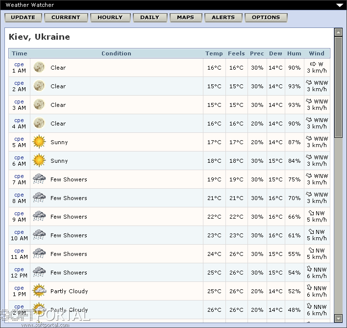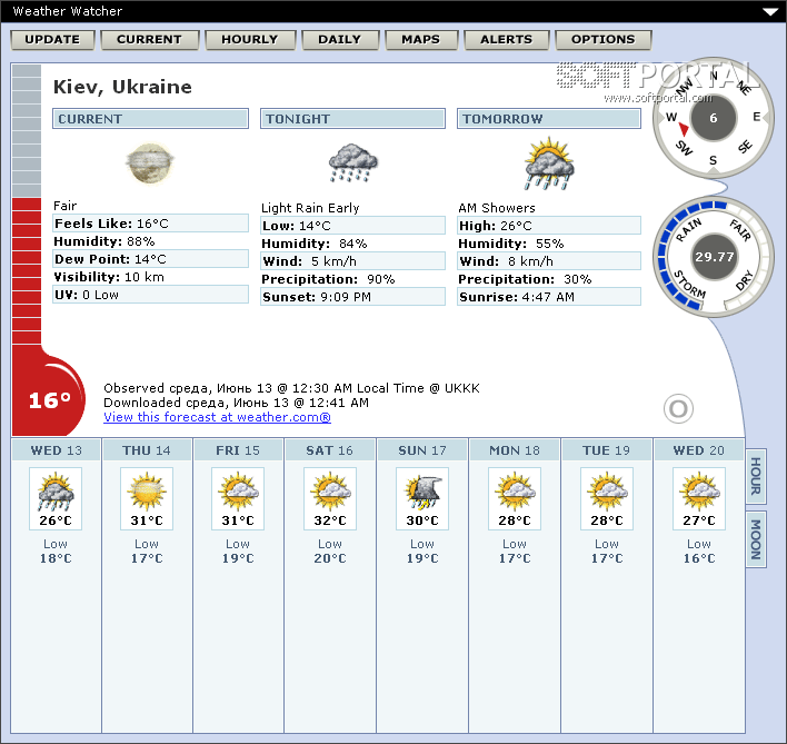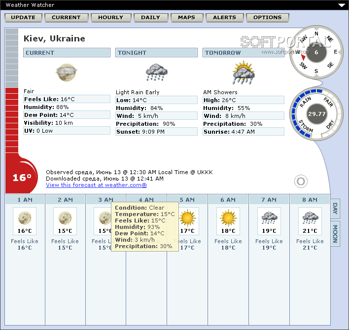 Weather Watcher - небольшая настольная погодная станция, которая спокойно "сидит" в системном трее и автоматически обновляет сведения о погоде в указанном интервале времени. Weather Watcher покажет Вам текущий прогноз, включая температуру, температуру "на ощущение" (т.е. температуру, которая будет ощущаться одетым по сезону человеком), влажность, ветер, видимость, давление, и ультрафиолетовое излучение.