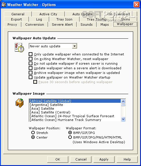 Weather Watcher может также дать Вам 10-дневный прогноз, который включает общие состояния окружающей среды, температурные максимумы и минимумы и ожидаемое ультрафиолетовое излучение. Погодные измерения могут быть показаны в метрических или английских единицах. Кроме этого Есть возможность просмотра текущих спутниковых фотографий выбранной страны.