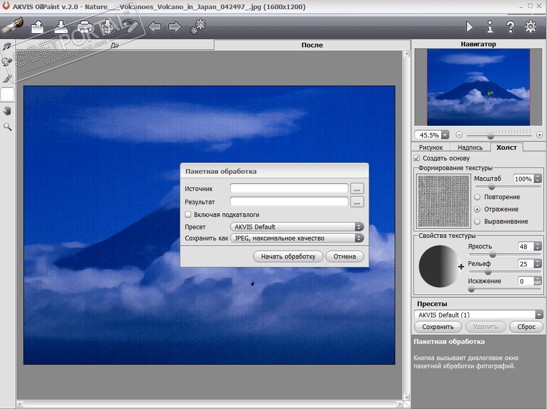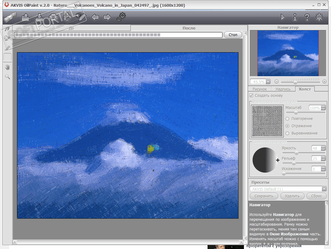 AKVIS OilPaint - мощная программа для имитации масляной живописи на различных картинках и фотографиях. Основной особенностей этой программы является уникальный алгоритм нанесения мазков кисти, с помощью которого наиболее точно и правдоподобно воспроизводится техника работы кистью. Таким образом происходит преобразование изображений в картину, написанную маслом. Есть возможность задать тип холста, разместить текст, а также использовать готовый набор пресетов, что позволит создать настоящий живописный шедевр. Для работы с большим объемом данных предусмотрена пакетная обработка группы изображений с одними и теми же настройками, что поможет быстро оформлять иллюстрации в одном стиле, создать мультфильм или даже комикс.