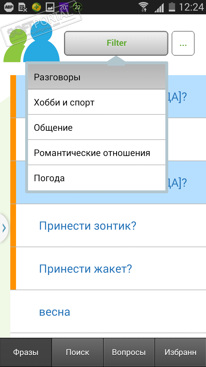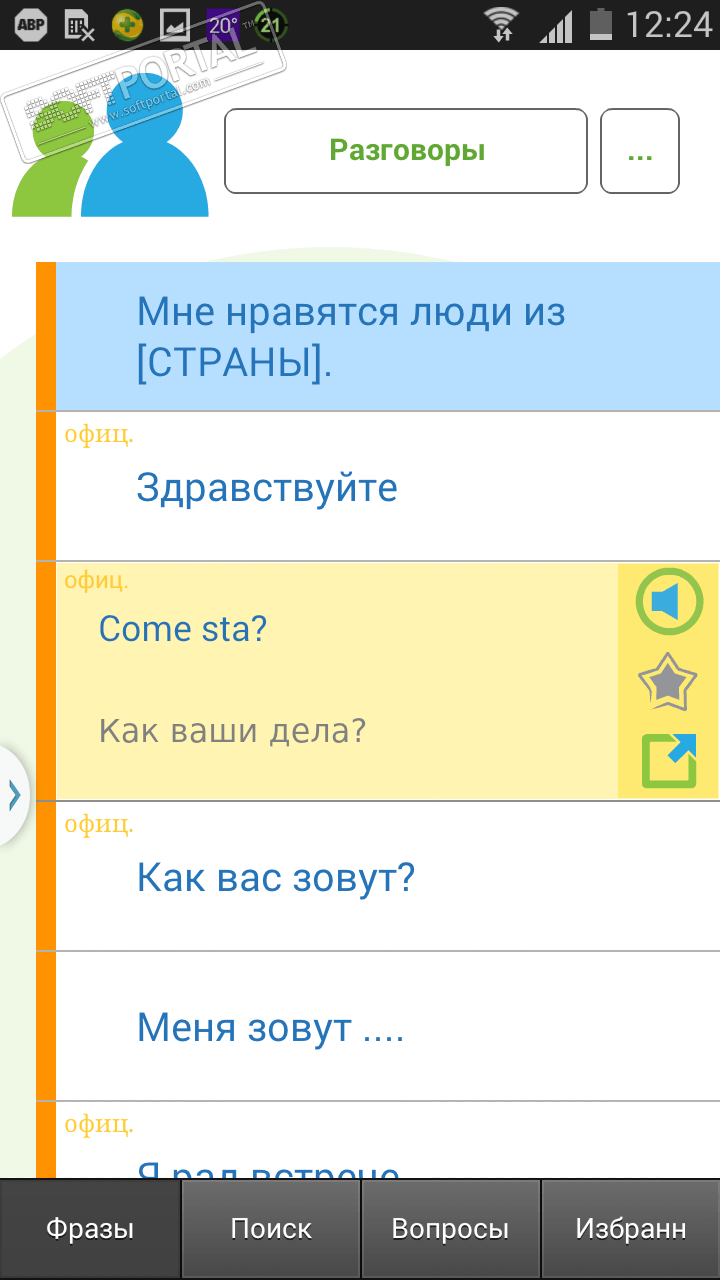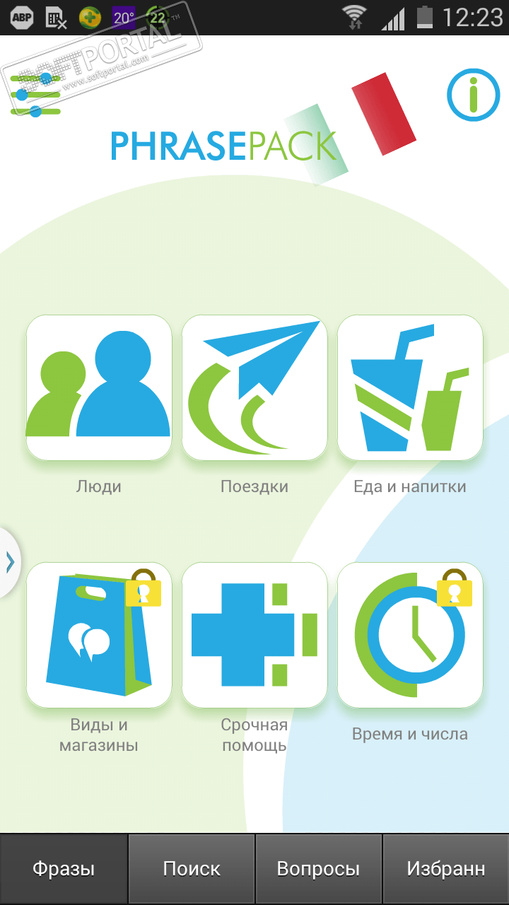 Разговорник итальянского языка - приложение для Android, которое представляет собой разговорник итальянского языка и содержит более 3500 слов и наиболее популярных и произносимых путешественниками фраз. Программа поможет Вам при общении с местными жителями в любой ситуации, например, если потребуется сделать заказ в ресторане, спросить, как пройти или проехать куда-либо. Все фразы и слова для удобства использования разбиты по категориям. Наиболее употребляемые фразы можно добавить в избранное. Для работы приложения не требуется Интернет-соединение.