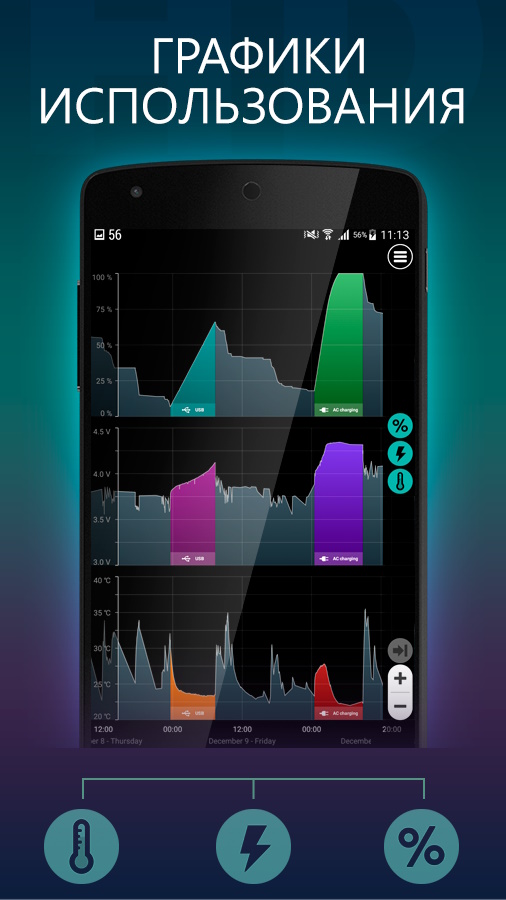 Приложение предоставляет информативные графики, отображающие загрузку, температуру и напряжение аккумулятора, а также дает возможность изменять цветовую гамму значка батареи.