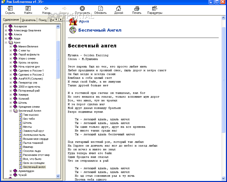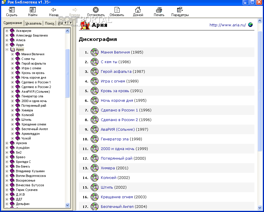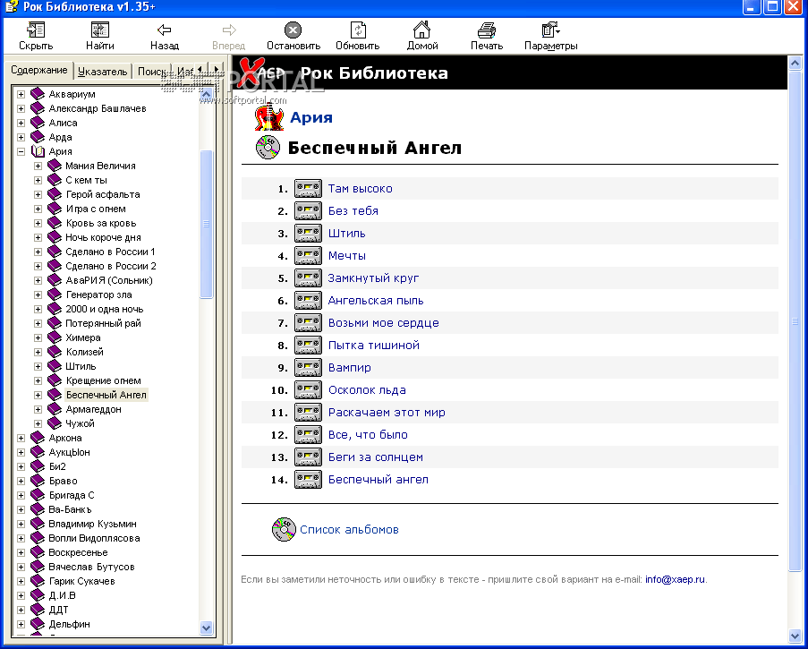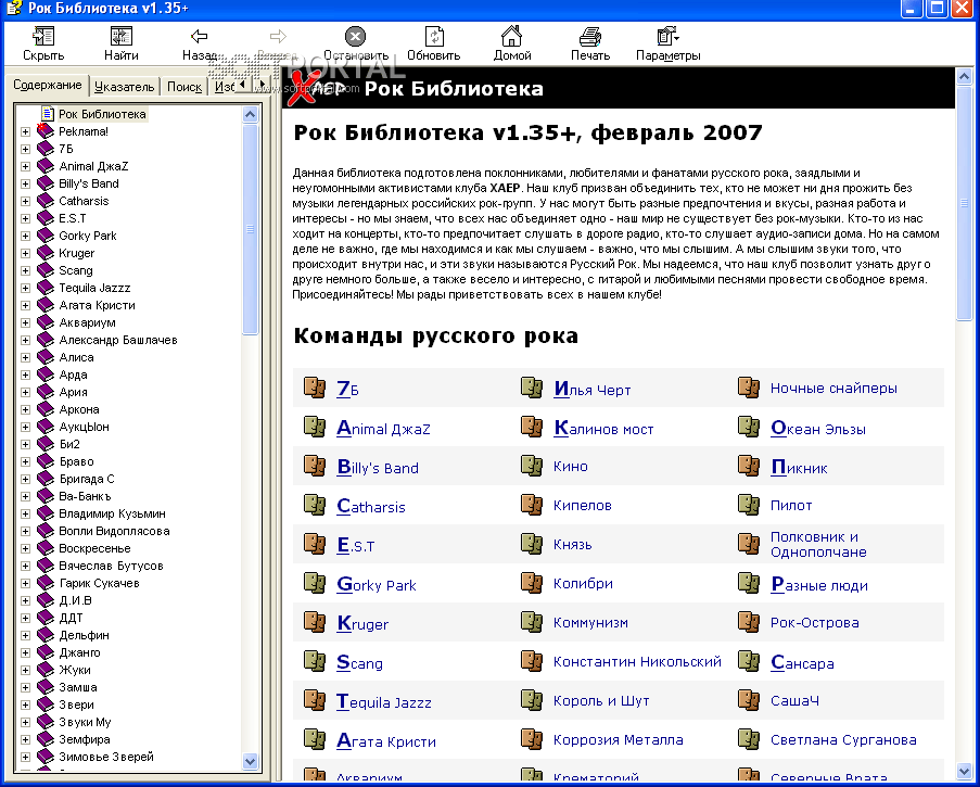 Большая Рок Библиотека - это удобный и хорошо оформленный сборник песен известных российских рок групп, энциклопедия дискографий в формате CHM. Удобная древовидная и индексная навигация по библиотеке позволяет быстро отыскать нужную песню.