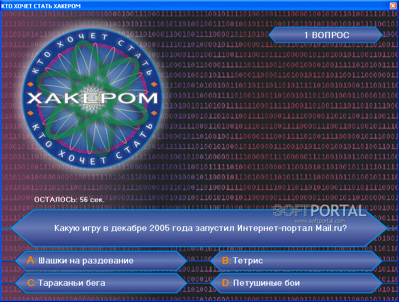 Кто хочет стать хакером? - это аналог игры "Кто хочет стать миллионером?" («О, Счастливчик!»), но с вопросами на компьютерную тематику (программирование, железо, операционные системы, КПК, электронные платежные системы, история развития ЭВМ и т.п.). Для победы необходимо ответить на 15 вопросов, преодолев 3 уровня: «Продвинтый чайник», «Юзер» и «Хакер». Отличие этой игры от оригинальной заключается только лишь в отсутствии возможности перекратить игру (т.к. брать, собственно, и нечего—всего ведь 3 уровня). Также вопросы не разделены на несколько уровней по сложности, т.к. все примерно одинаковые.