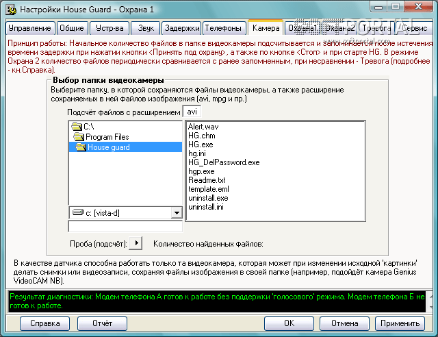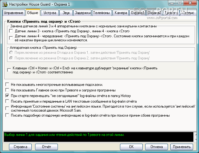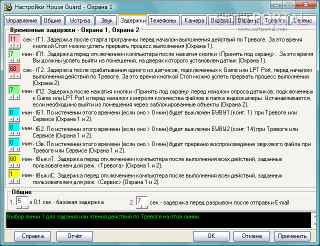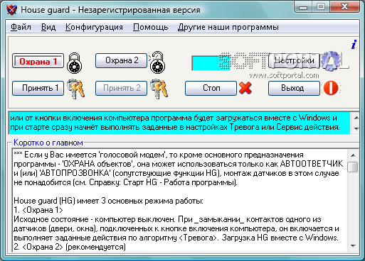 ОХРАННИК (House guard) - программа для охраны Вашего дома, офиса или любых других помещений при помощи компьютера. Компьютер, в зависимости от выбранного режима работы, может находиться в 2-х исходных дежурных состояниях: <Охрана 1> (выключен) или <Охрана 2> (включен).