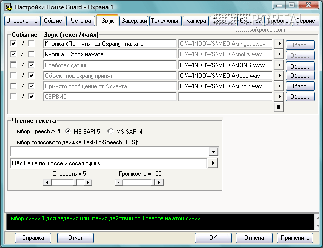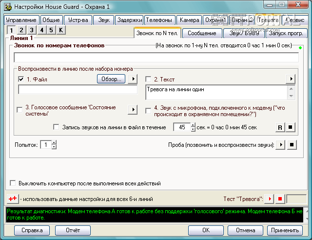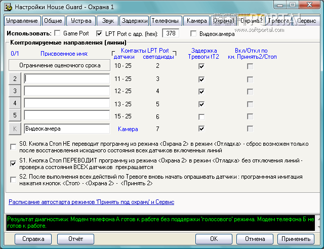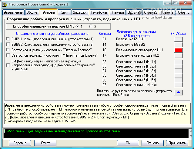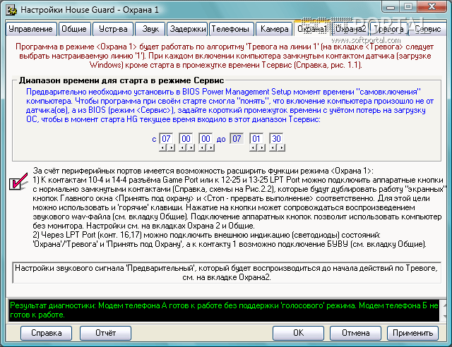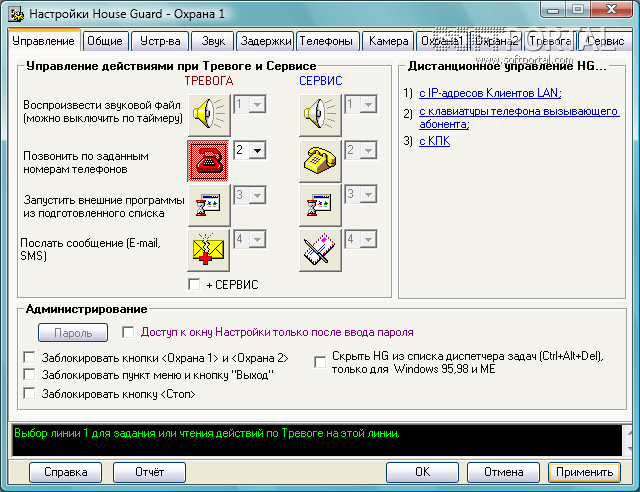 В режиме Охрана 1 при открытии заблокированных дверей или окон, компьютер включится сам, включит внешний модем и активные колонки, а программа выполнит заданные действия. В режиме Охрана 2 через Game или LPT Port контролируется до 5 разных направлений, 6-е направление - видеокамера. При срабатывании одного из датчиков программа может выполнить для каждой линии разные, заранее заданные Вами действия (Тревога):