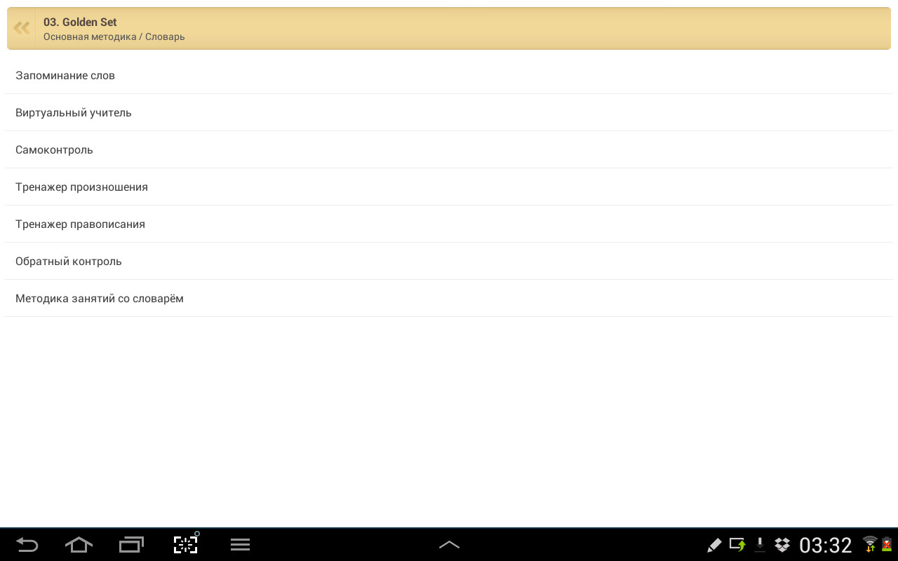 Изучать язык можно как по отдельным словам, так и по фразам, которые состоят из слов, используемых в словаре. Следует отметить, что проводить обучение можно в нескольких режимах: Запоминание слов, Виртуальный учитель, Самоконтроль, Тренажер произношения, Тренажер правописания, Обратный контроль и Методика занятий со словарем, каждый из которых имеет свои особенности, направленные на получение новых знаний и закрепления пройденного материала.