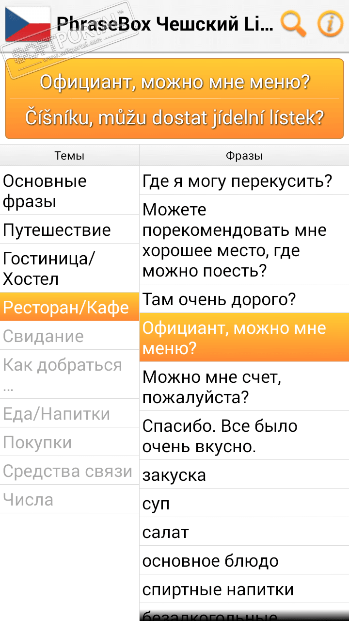 Разговорник Чешский Lite - бесплатное приложение для Android-смартфонов и планшетов, которое представляет собой чешский разговорник с наиболее употребляемыми словами и фразами чешского языка. Программа будет полезна пользователям, которые собираются совершить зарубежную поездку, но при этом практически не владеют иностранным языком.