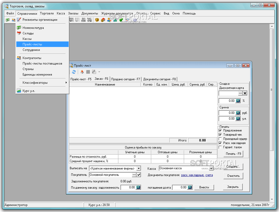 Торговля, склад, заказы - удобное и эффективное решение для организации учета в торговле. Программа позволяет быстро подобрать нужные товары, сформировать заказ, предоставить скидку (в т.ч. по дисконтным картам), распечатать необходимый пакет документов.