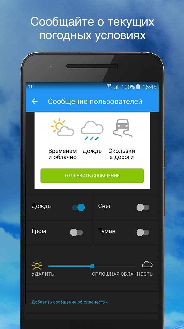 Если Вы увидели, что отображаемый прогноз не полностью соответствует действительности или возникают неблагоприятные дорожные условия, то можете сообщить об этом на сервер приложения для уточнения и исправления, тем самым внеся и свой вклад в развитие проекта.