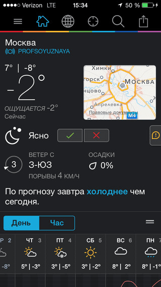 Weather Underground - приложение для получения самого точного прогноза погоды с возможностью доступа к спутниковым данным и картам. Уникальность этой программы в том, что погодные данные формируются с помощью сообщества энтузиастов метеорологии, передающих данные со своих погодных станций на сервер приложения, что позволяют иметь погодную обстановку точно для Вашего местоположения.