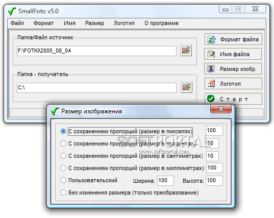 SmallFoto - программа предназначена для уменьшения и увеличения размеров изображений, преобразования изображений из одного формата в другой, наложения логотипа, переименования файлов, групповой обработки изображений и т.д.