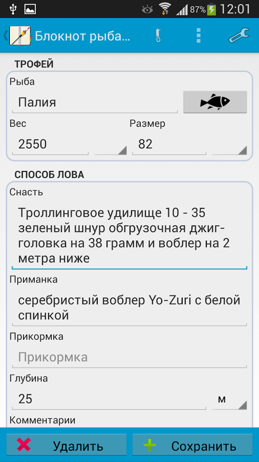 - возможность учета размера улова и суммарный вес, фотографии улова;