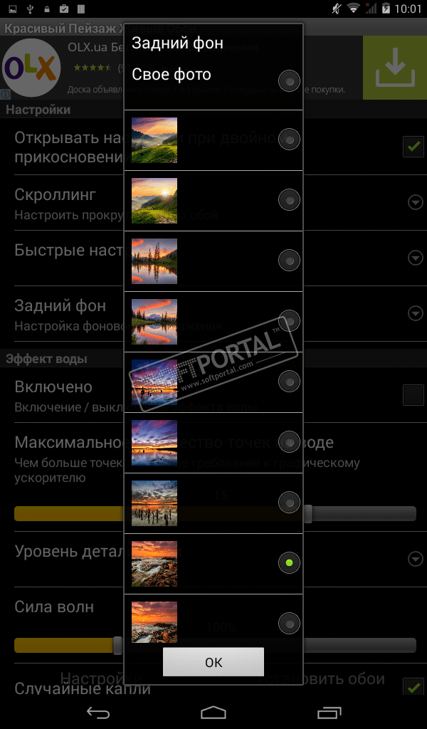 - Набор пейзажей на выбор (природа, горы, закат на берегу океана, горное озеро, поле с лавандой, луг с маками, ...) в HD качестве + возможность установить свое фото