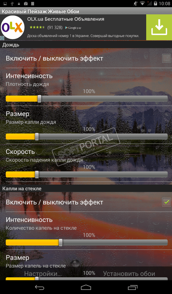 Landscape Wallpaper - красивые бесплатные живые обои с эффектом живой воды или живого дождя (на выбор), с эффектом запотевшего стекла по которому можно рисовать пальцем, набором из 15 HD фотографий для заднего фона, анимированными каплями дождя на стекле, множестовм настроек и многим другим.