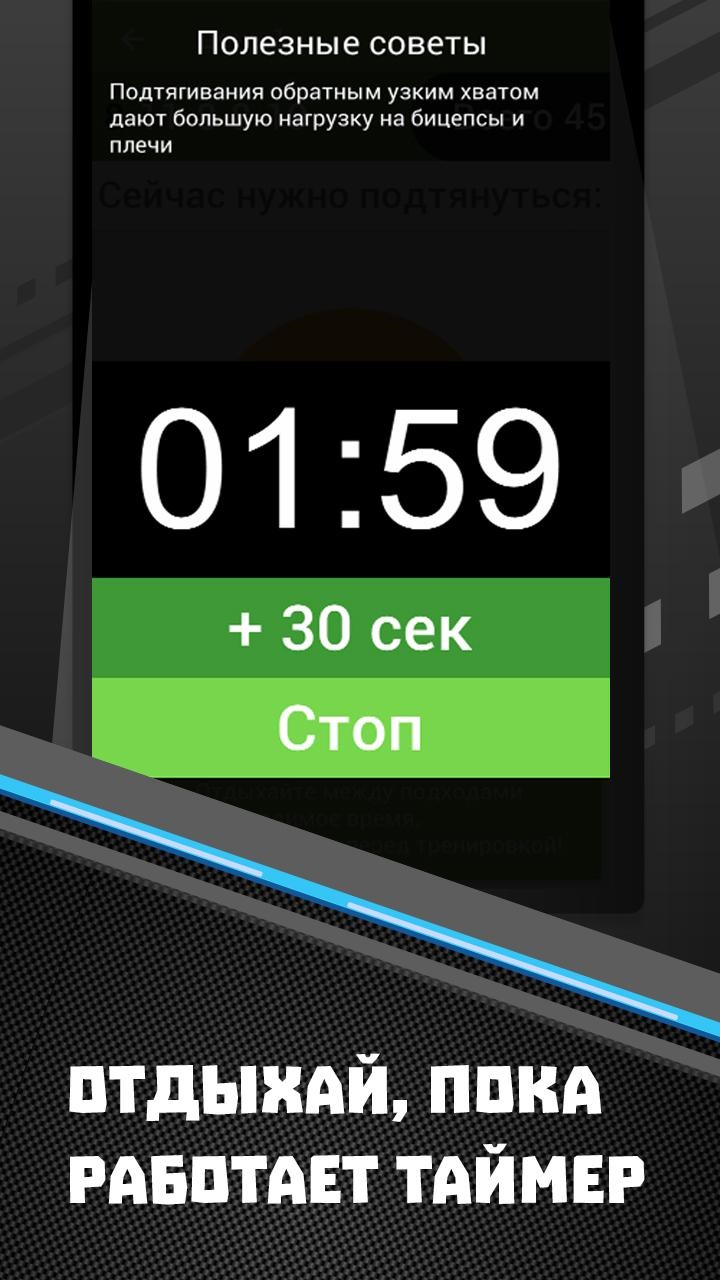 Прежде чем приступить к тренировкам, нужно пройти тест, по результатам которого выбирается соответствующая программа. Тест заключается в том, чтобы определить какое максимальное количество подтягиваний за раз вы можете сделать. Обязательно не забывайте отдыхать - есть таймер для контроля времени перерыва: если по ощущениям этого времени будет недостаточно, то увеличивайте его при необходимости. Кроме того, соблюдайте режим правильного питания и здорового сна.