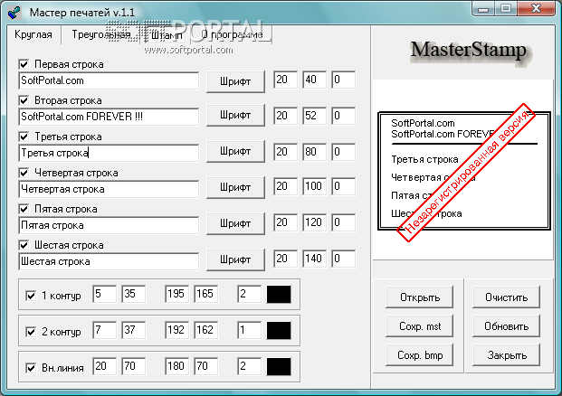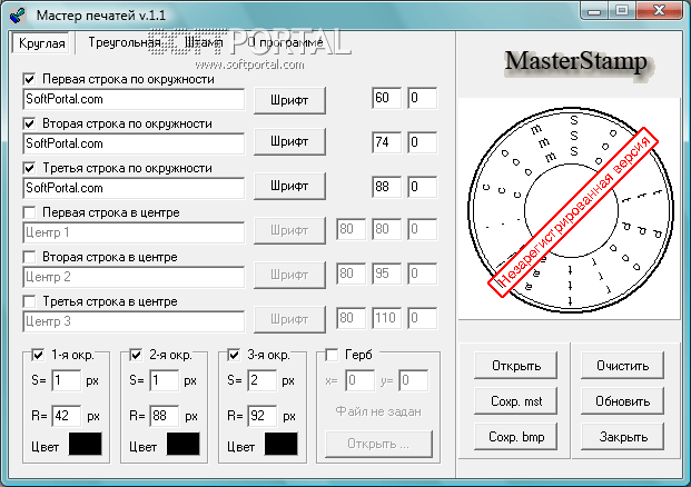 MasterStamp (мастер печатей) - программа для создания печатей (круглой, треугольной и прямоугольной (штамп)). Вы можете изменить расположение, шрифт, цвет букв и фигур (окружностей и линий) буквально попиксельно. Полученный результат можно сохранить в формат .bmp или .mst. Программа имеет простой понятный интерфейс, не требует инсталляции.